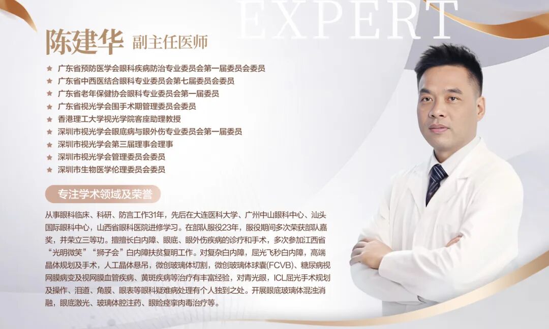 01 先天性白内障的治疗需结合患儿年龄、晶状体混浊程度、视力影响情况制定方案,核心目标是去除混浊晶状体、**光线通路,为视力发育创造条件,预防弱视和斜视。 02 观察等待(适用于“轻度、非中心性混浊”) 若晶状体仅周边轻度混浊,中央区域透明(如“冠状白内障”“点状白内障”),未影响视力发育,可暂时不手术,定期(每 3~6 个月)复查:观察混浊是否进展、视力是否下降;若出现混浊加重或视力发育迟缓,需及时转为手术治疗。 03 手术治疗(适用于“中重度混浊、影响视力”) 手术是治疗先天性白内障的主要方式,手术时机是关键。 ·单眼白内障:建议在出生后 2~3 个月内手术,越早手术,术后弱视的风险越低(单眼混浊会导致“双眼视差”,若拖延会形成不可逆弱视)。 ·双眼白内障:若混浊严重,建议在出生后 3~6 个月内完成双眼手术(间隔 1~2 周);若混浊较轻,可适当推迟,但需密切监测视力。 04 ·屈光矫正:术后患儿眼内缺少晶状体(或人工晶状体度数需调整),需通过框架眼镜、角膜接触镜(RGP 镜,更适合婴幼儿)矫正屈光不正,确保视网膜能清晰成像。 ·弱视训练:若术后存在弱视(视力低于同龄正常水平),需在医生指导下进行训练(如遮盖健眼、精细目力训练、红光闪烁训练),通常需持续至视力发育稳定(约 6~12 岁) ·定期复查:术后 1 年内每 1~2 个月复查一次,1 年后每 3~6 个月复查,根据情况调整眼镜度数或训练方案。 深圳南山华厦眼科医院 深圳南山华厦眼科医院汇聚了一批优秀的深圳本地眼科专家,并成立“全国眼科名医工作室”,引进众多国内外**眼科医生,以丰富的临床经验和深厚的学术造诣,为患者提供高水平的诊疗服务。 我院陈建华主任从事眼科临床、科研、防盲工作31年,擅长白内障、眼底、眼外伤疾病的诊疗和手术,对复杂白内障,屈光飞秒白内障,高端晶体规划及手术,对青光眼,ICL屈光手术规划及操作、泪道、角膜、眼表等眼科疑难病处理有个人独到之处。